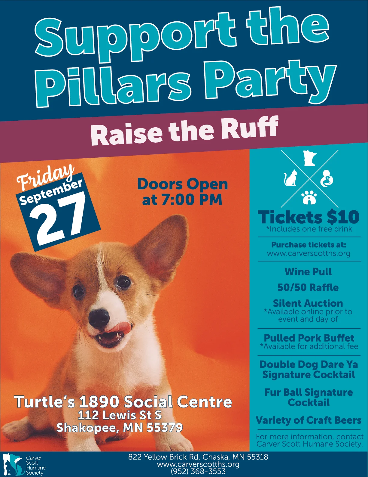 On Friday, September 27, 2019, Carver Scott Humane Society (CSHS) is celebrating 30 years in the community with our annual Support the Pillars Party at Turtle’s 1890 Social Centre. The Support the Pillars Party is bringing together community members and supporters to celebrate CSHS’s successes, raise awareness about our animal rescue services, and deepen our relationships in the community to make it possible to connect animals in need with people who care.
